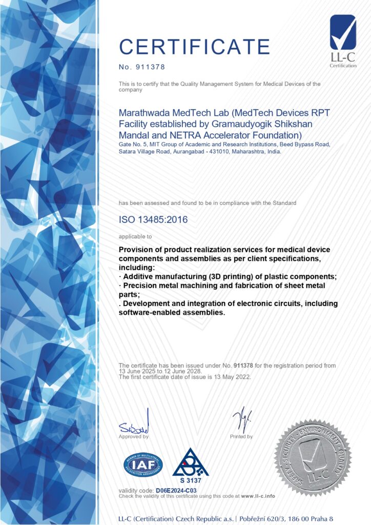 Marathwada MedTech Lab (MMTL) is an ISO 13485:2016 certified Medical Devices Rapid Prototyping Facility. It is an initiative of Gramaudyogik Shikshan Mandal (GSM) and Netra Accelerator Foundation funded by BIRAC as a part of National Biopharma Mission, Government of India.
